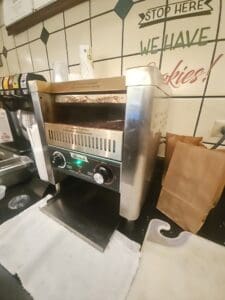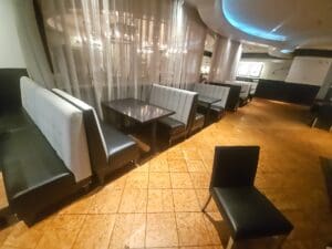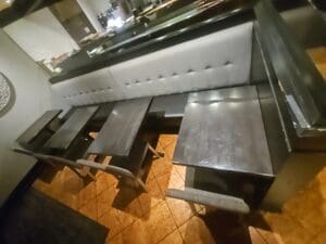 · Pitco 40lb gas deep fryer with stainless steel frame · Stainless steel tilt kettle with drain valve · Blodgett double stack gas convection oven · Winco C-Vap vertical single door cook and hold unit · Turbo Air refrigerated salad/Sandwich prep cooler · Silver king NEW table top refrigerated prep cooler · Kitchen Aid table top mixer · Hobart 20qt mixer with attachments · Bizerba table top slicer · Three compartment stainless steel sink with right and left drain board · Avantco refrigerated back bar cooler with glass doors · Vulcan 6 burner range with under oven and top mounted Cheese melter · Vulcan under counter electric cook and hold cabinet · Assorted stainless steel wall mounted shelves · Eco-Lab stainless steel electric glass washing machine · Bakers Pride six burner range with under oven · SouthBend 6 burner range with under oven · Waring Panini electric maker · True top door electric mug chiller refrigerated unit · Delfield vertical single door refrigerated cooler · Avantco vertical two door stainless steel freezer · Arctic Air single door freezer · Superior single door freezer · Wooden top tables with black metal pedestal bases · Vinyl cushion top bar stools · Vinyl cushion wooden framed wall benches · AND MORE!